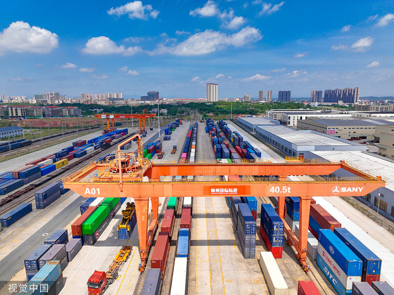 7月21日,江西赣州国际陆港货场内,龙门吊起重机正在吊运集装箱货柜。(图源:视觉中国)