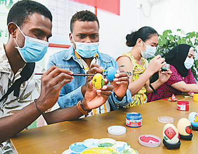端午节期间,来自刚果(金)等国的留学生在江苏省镇江市新金江社区画彩蛋。 石玉成摄(人民图片)