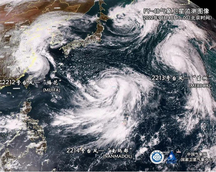 今年第12号台风“梅花”已登陆我国。此时,西北太平洋洋面上还有两个台风正在发展,分别是今年第13号台风“苗柏”、第14号台风“南玛都”。