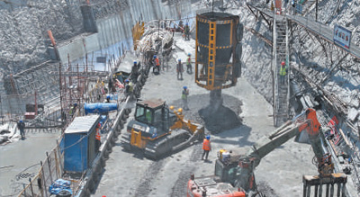 工人在东庄水利枢纽大坝导流底孔用吊罐下料浇筑混凝土。