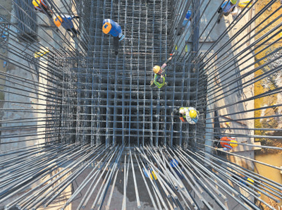工人在引汉济渭二期工程南干线浐河渡槽飞鸟拱桥桥墩绑扎钢筋。