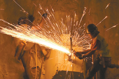 工人在东庄水利枢纽左岸水垫塘边坡混凝土护坡焊接钢筋。