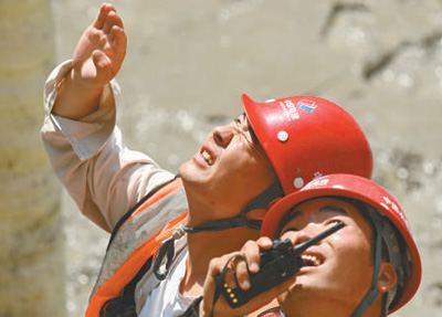东庄水利枢纽施工现场,报话员指挥缆机移动定位。