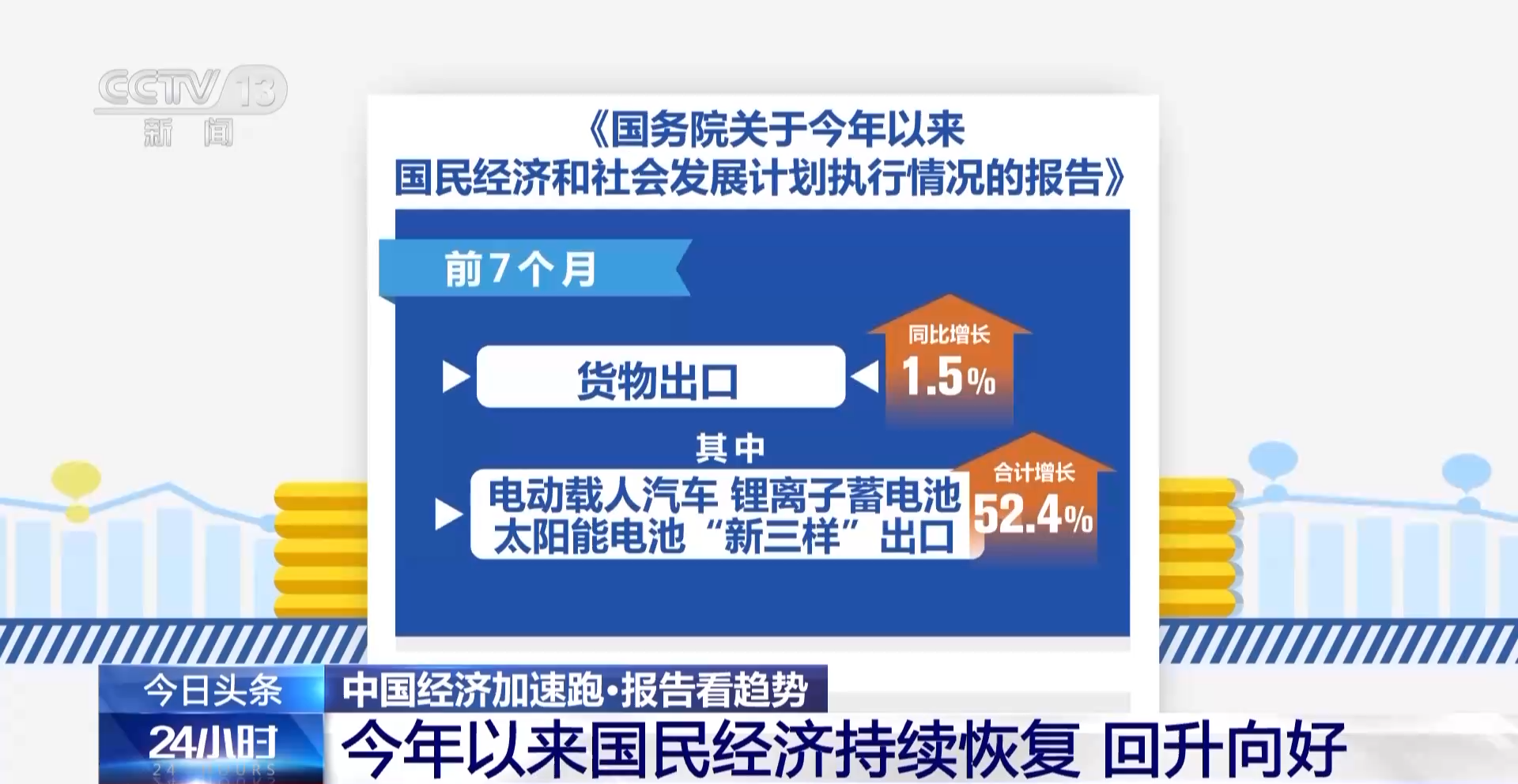 报告指出,前7个月货物出口同比增长1.5%,其中电动载人汽车、锂离子蓄电池、太阳能电池“新三样”出口合计增长52.4%。知识密集型服务贸易较快增长,旅行服务贸易明显恢复,上半年服务进出口同比增长8.5%。推动外资标志性项目落地实施,外贸外资平稳发展。