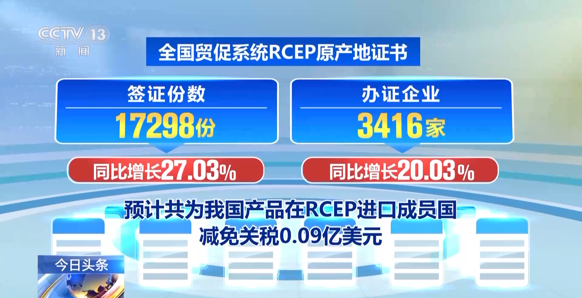 中国贸促会8月30日介绍:今年7月份,全国贸促系统累计签发原产地证书等各类证书54.62万份,较上年同比增长12.82%。全国贸促系统RCEP原产地证书签证份数为17298份,同比增长27.03%;办证企业3416家,同比增长20.03%,预计共为我国产品在RCEP进口成员国减免关税0.09亿美元。