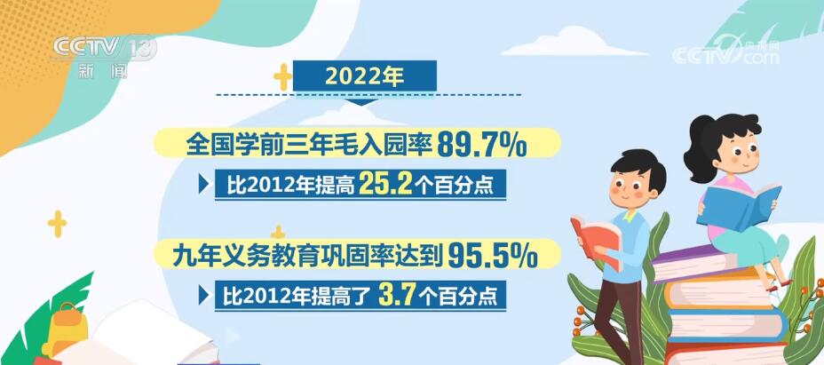据介绍,党的十八大以来,我国基础教育政策制度体系进一步健全,基础教育发生了格局性变化,取得了历史性成就。我国基础教育普及水平大幅提高。2022年,全国学前三年毛入园率89.7%,比2012年提高25.2个百分点。九年义务教育巩固率达到95.5%,比2012年提高了3.7个百分点,适龄残疾儿童入学率超过95%。高中阶段教育毛入学率91.6%,比2012年提高6.6个百分点。我国基础教育普及水平总体达到世界中上行列。