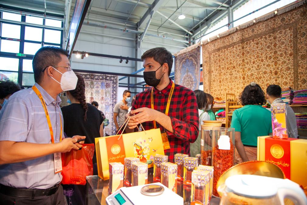 2022年9月5日,观众(左)在服贸会首钢园区文旅服务专题展区伊朗展台购买商品。(新华社记者张帆摄)