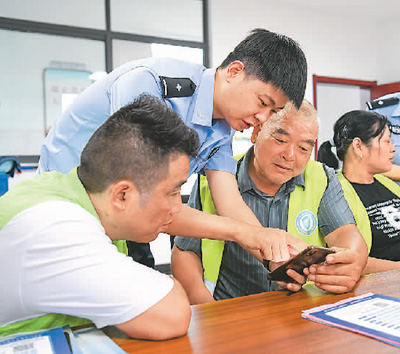 近日,安徽省含山县公安局花山派出所联合县局反诈小分队走进社区,开展以“反诈进社区‘警社共治’保平安”为主题的防范电信网络诈骗宣防活动。图为含山县公安局民警演示下载国家反诈APP方法。冯善军摄(人民图片)