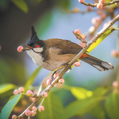 广东省广州市黄埔中心城区市民公园里,一只红耳鹎在享用丰盛的浆果早餐。
