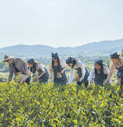 福建高校的中外学生在武夷山生态茶园体验采茶。