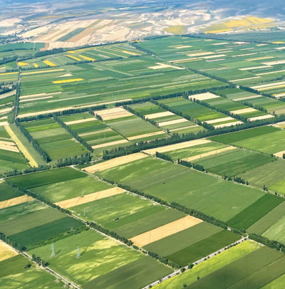 从高空俯瞰位于新疆维吾尔自治区伊犁哈萨克自治州特克斯县的田野,不同农作物构成一幅生态文明的美丽画卷。