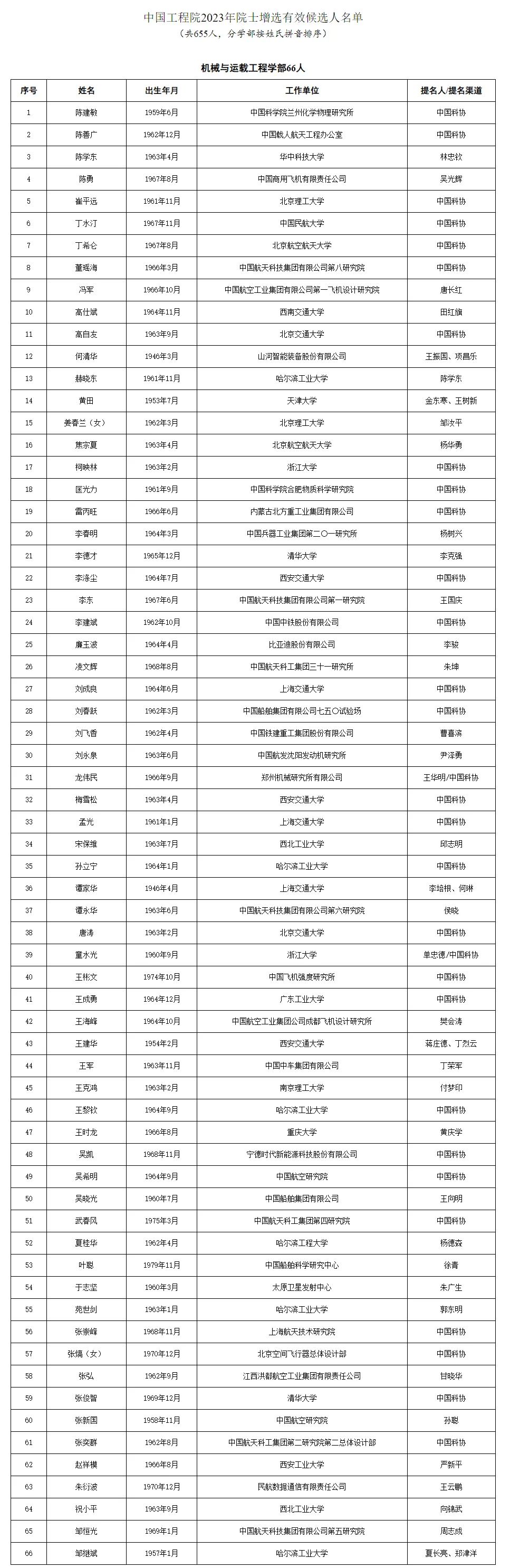 中国工程院2023年院士增选提名工作已经结束。经中国工程院第八届主席团第六次会议审议,中国工程院党组审定,确认中国工程院2023年院士增选有效候选人655人。根据《中国工程院院士增选工作实施办法》的规定,现将有效候选人名单予以公布。