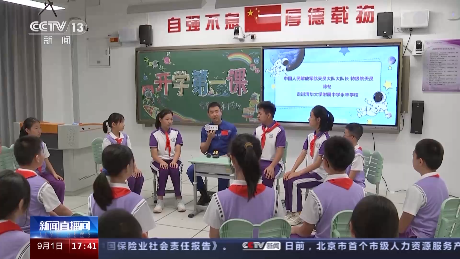 在清华附中永丰学校,我国航天员陈冬为新生们上了开学第一课,他勉励同学们勇敢探索未知,用智慧和汗水打造自己的梦想飞船。