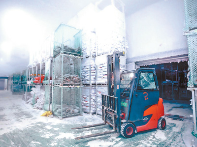 福建省福州市马尾区,叉车在超低温冷库里进行装卸作业。