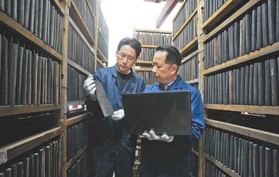 郑宗男(右)正和同事将雕版录入数字化系统。