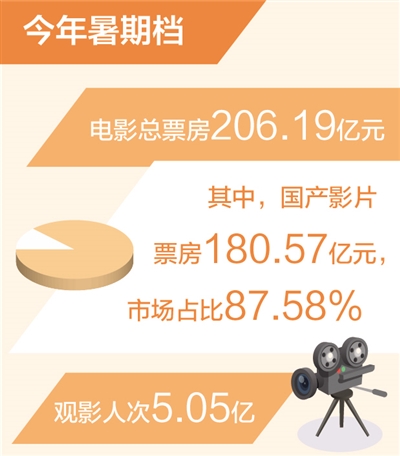 人民日报北京9月4日电 (记者刘阳、任姗姗)记者近日从国家电影局获悉:今年暑期档(6月1日至8月31日)电影总票房206.19亿元,观影人次5.05亿,这是我国暑期档票房首次超过200亿元,刷新历史同档期最高纪录。国产影片票房180.57亿元,市场占比87.58%。一系列亮眼的数据,反映出中国电影强劲复苏、生机勃勃的景象。