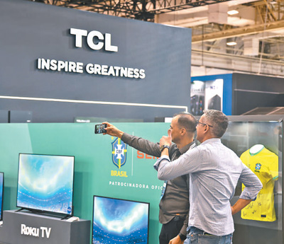 在2023年圣保罗国际消费类电子及家用电器产品展览会上,参观者在TCL展台前合影留念。