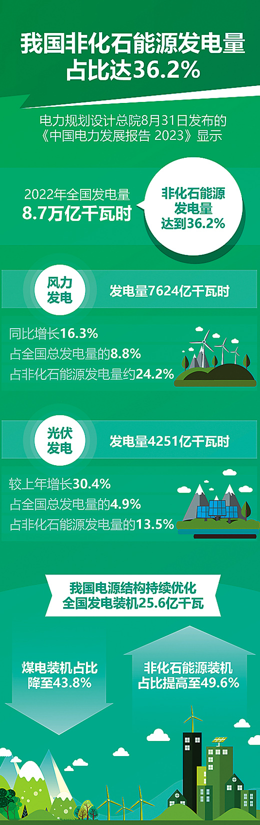 国家能源局数据显示,截至今年6月,全国可再生能源装机达13.22亿千瓦,历史性超过煤电,占总装机的48.8%,超过全球可再生能源装机的三分之一,水电、风电、太阳能发电装机分别连续18年、13年、8年稳居世界第一位。2022年,全国可再生能源发电量达2.7万亿千瓦时,占全社会用电量的31.6%,较2012年增长约11个百分点。其中,风电、光伏发电量首次突破1万亿千瓦时,与城乡居民生活用电量相当。同年,可再生能源新增装机和发电量分别占全国新增发电装机和发电量的76.2%和81%,已成为电力新增装机和发电量的主体。