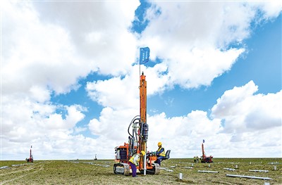 近年来,地处毛乌素沙漠腹地的内蒙古自治区鄂尔多斯市鄂托克前旗,充分利用沙漠腹地富集的光能和风力资源优势,大力发展绿色能源产业。图为8月27日,打桩机在鄂托克前旗一处光伏电站项目建设工地施工。王 正摄(人民图片)