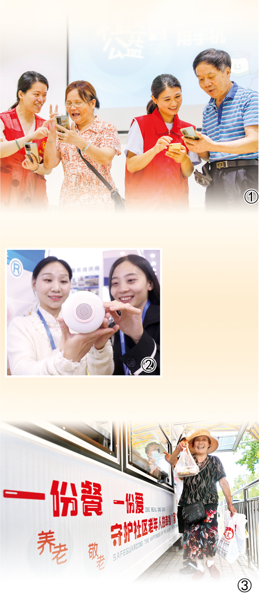 图①:福建福州市鼓楼区安泰街道于山社区,志愿者教老人使用智能手机。