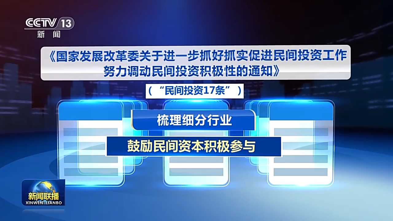 今年,中共中央、国务院出台关于促进民营经济发展壮大的意见,加大对民营经济政策支持力度、促进民营经济发展。随后国家发展改革委出台“民间投资17条”,梳理细分行业,鼓励民间资本积极参与。