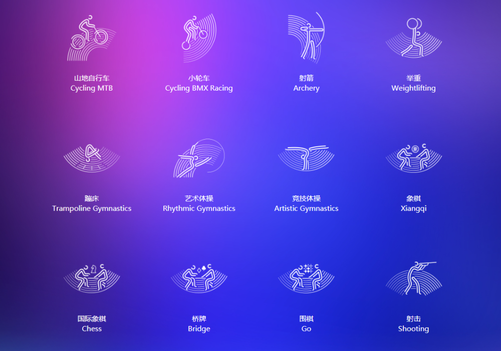 2018年8月6日,杭州第19届亚运会会徽“潮涌”正式发布。2020年9月22日,与之呼应的59个体育图标揭开神秘面纱,它们结合体育运动的“态”与“势”,以生动准确的运动造型,凝练表达了亚运会各体育项目专业动作最精彩的瞬间,充满动感与力量。