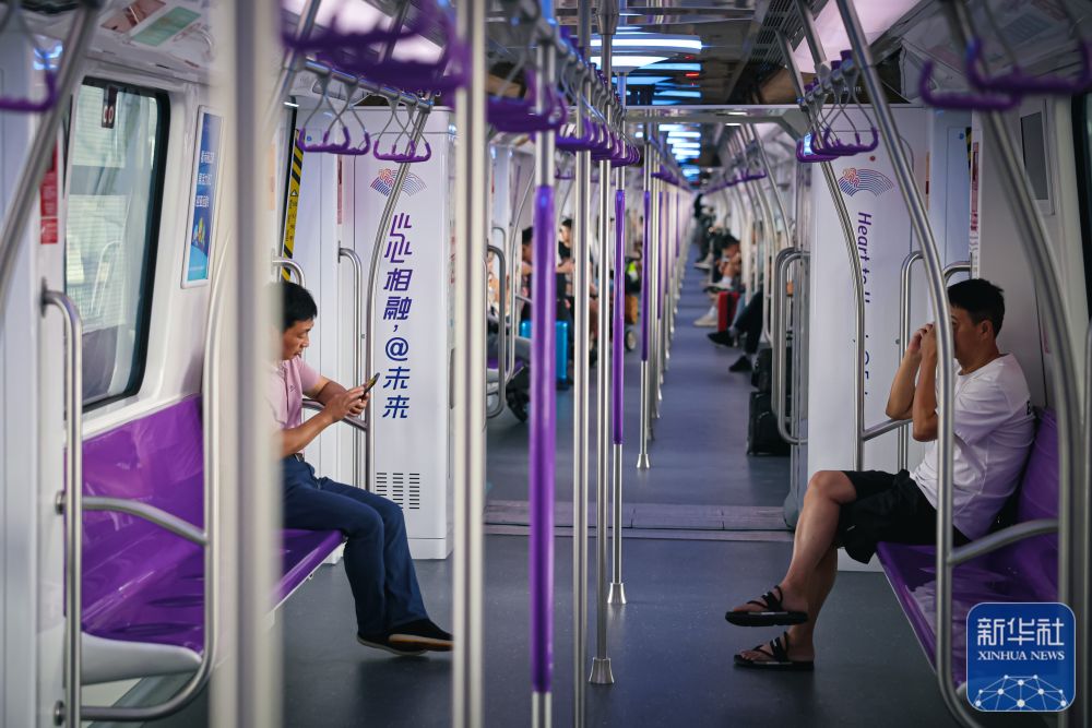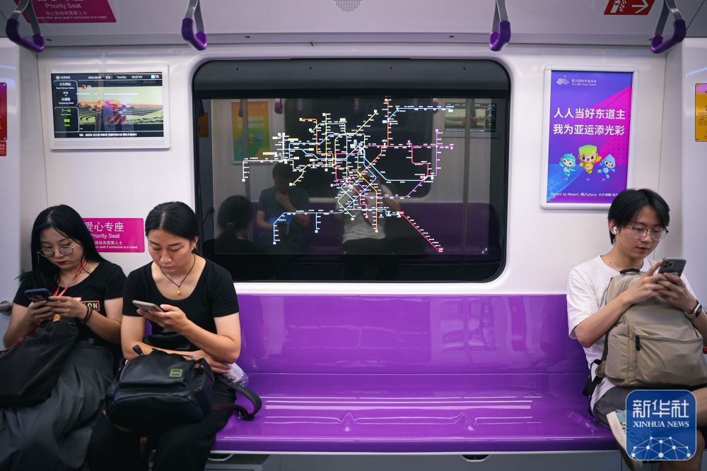 ↑9月5日,市民乘坐杭州地铁“亚运号”专列出行。