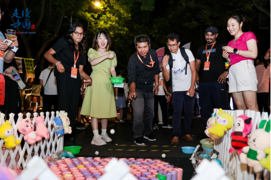 尝遍美食后,记者们又涌向了夜市的游戏区。他们满怀干劲地参与了“彩虹乒乓球”“投掷硬币”“套圈”等游戏。“彩虹乒乓球”游戏中,巴基斯坦《城市新闻网》高级记者Ali Abbas大显身手,乒乓球在手中转个不停,然后“嘭”的一声准确地投进了杯子中。连主持人也忍不住赞叹:“外国朋友的游戏技术真是令人眼花缭乱!”三色路上响彻着记者们的欢声笑语,他们亲身感受到这条文化之街的独特魅力。