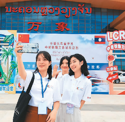 中老铁路今年开行国际旅客列车,进一步便利了人员往来。图为6月21日,老挝青年乘坐中老铁路之前在车站拍照留念。