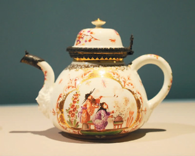 欧洲人还仿照中国瓷茶具、宜兴紫砂器烧制陶瓷茶具,其造型和纹饰深受中国文化影响。此次展览中展示了维多利亚与艾伯特博物馆收藏的“中国风”茶具,如英国沃克斯豪尔瓷厂烧造的软瓷印花青花庭院图茶叶罐,德国麦森瓷厂烧造的红陶模印花卉纹壶、珐琅彩描金人物图杯及杯托等。