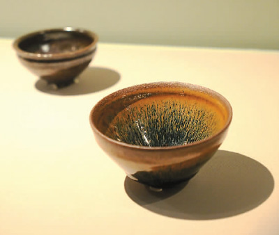 宋代黑釉兔毫盏(右)、黑釉油滴盏(左),故宫博物院藏。