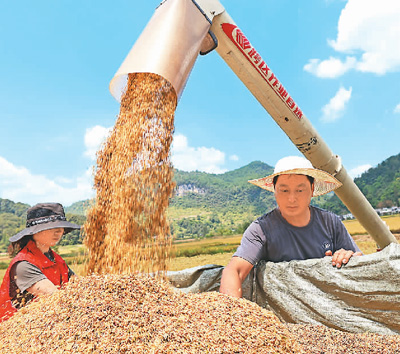 9月6日,在重庆市彭水苗族土家族自治县双龙乡龟池村,村民正充分利用晴好天气,抢抓农时,组织收割机抢收水稻,确保颗粒归仓。