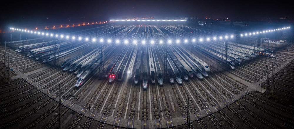 1月7日凌晨,动车组停靠在武汉动车段的存车线上进行检修和保温作业(无人机拼接照片)。新华社记者 伍志尊 摄