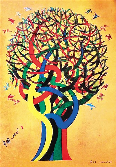 黄永玉在2008年北京奥运会举办期间创作了巨幅油画《中国=mc2》,其灵感来源于爱因斯坦提出的质能方程E=mc2。作品以“中国”替代“E”,表达了中国几十年高速发展积累的能量,将以奥运为契机与载体,发出强有力的声音。画面描绘了八方瑞鸟来贺奥运的友谊之树,巨大的球状网络,神似北京的奥运地标“鸟巢”,象征着北京的待客之道与开放包容。