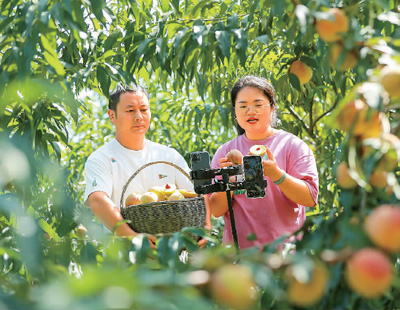 湖北省宜昌市秭归县利用山区独特的资源优势,在海拔600米以上的山坡地带,采取“公司+合作社+基地+农户”的方式,引导和鼓励农民在种植、加工、储运、销售等产业链条的多环节上获取红利,助力乡村产业振兴。图为秭归县郭家坝镇西坡村回乡新农人陈霞(右)和家人在果园直播销售锦绣黄桃。