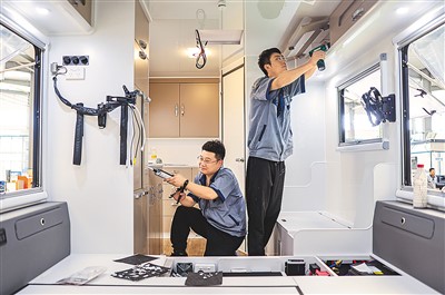 8月24日,山东省荣成市一家房车制造企业的工人在安装房车组件。