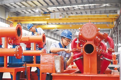 8月27日,河北省邢台市一家“小巨人”企业的工人在组装钻井泥浆环保处理装置。
