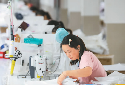 9月11日,在江苏省淮安市一家民营企业,工人正在加工羽绒寝具。