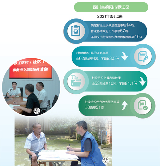 一减一增,见证乡村治理效能提升。今年,四川省德阳市罗江区的村级组织为群众开具证明事项由2021年3月前的62项减少至4项,下沉至村级办理的政务服务事项则由0增至51项。