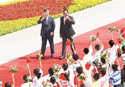 九月十五日上午,国家主席习近平在北京人民大会堂同来华进行国事访问的赞比亚总统希奇莱马举行会谈。这是会谈前,习近平在人民大会堂东门外广场为希奇莱马举行欢迎仪式。