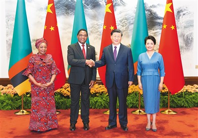 九月十五日上午,国家主席习近平在北京人民大会堂同来华进行国事访问的赞比亚总统希奇莱马举行会谈。这是会谈前,习近平和夫人彭丽媛同希奇莱马和夫人穆廷塔合影。