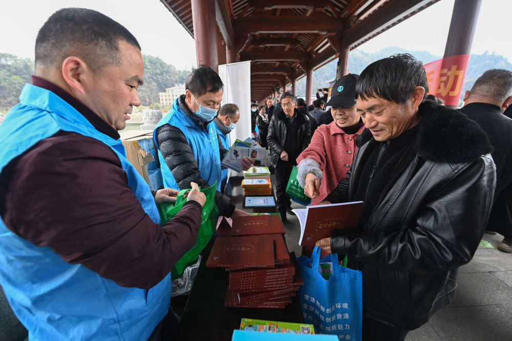 在杭州市临安区昌化镇举行的春季文化科技卫生“三下乡”服务活动上,临安区科学技术协会“三服务”小分队的党员志愿者将科普书籍赠送给当地群众(2023年2月22日摄)。新华社记者 徐昱 摄