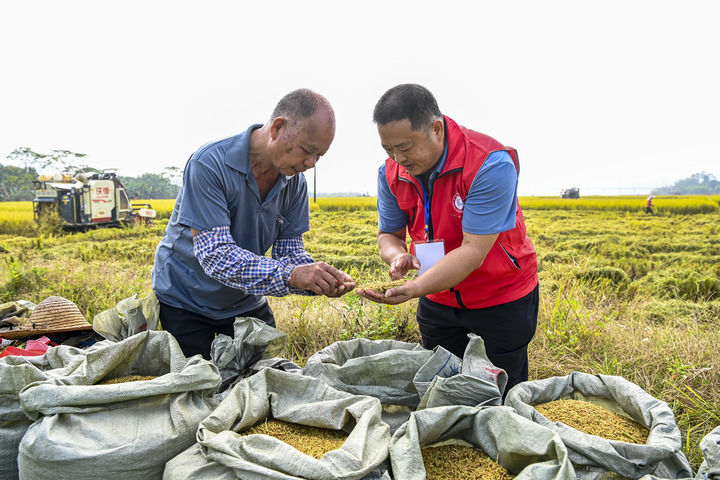 在广西兴业县石南镇凤山村的稻田里,科技特派员(右)在查看晚稻品质(2022年11月10日摄)。新华社记者 曹祎铭 摄