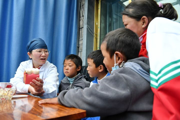 在西藏浪卡子县普玛江塘乡,上海市徐汇区牙病防治所的医生苏红如向小朋友科普牙齿保健知识(2023年7月8日摄)。新华社记者 张汝锋 摄