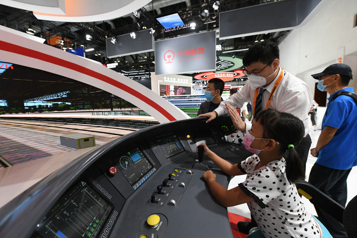 小朋友在2022年中国国际服务贸易交易会国家会议中心展馆体验京张高铁动车组模拟驾驶台(2022年9月3日摄)。新华社记者 任超 摄