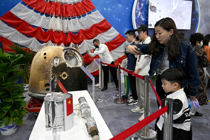 观众在安徽合肥举办的以“走向世界的中国航天”为主题的展览上参观嫦娥五号返回器等实物展品(2023年4月24日摄)。新华社记者 黄博涵 摄
