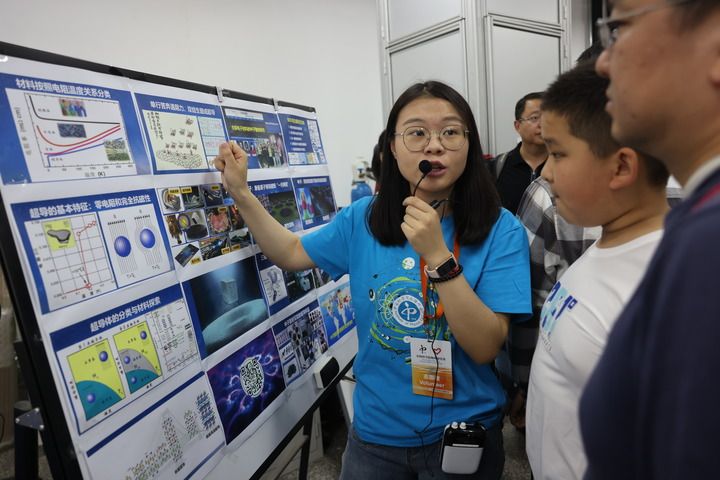 在中科院物理研究所超导国家重点实验室,志愿者在向参观者普及超导知识(2023年5月13日摄)。新华社记者 金立旺 摄