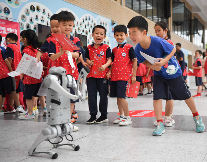 在湖南长沙华夏实验学校举办“科技大篷车”进校园活动上,学生们在和机器狗互动(2022年6月22日摄)。新华社记者 薛宇舸 摄