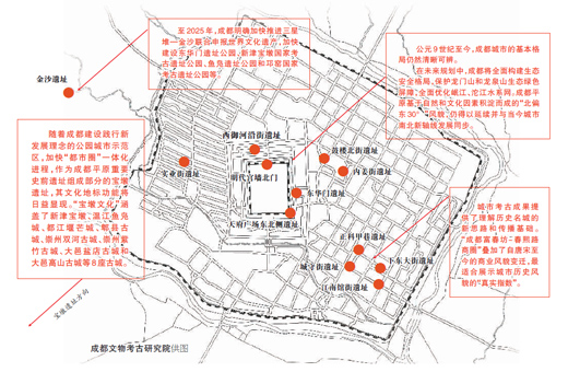 依据多年积淀的考古成果,成都市区与成都平原上分布的“北偏东30°”历史景观日益清晰起来;串联行走在巨大、连片的考古遗址群或地下埋藏区间,更能准确认知这座城市的过去、现在与未来。