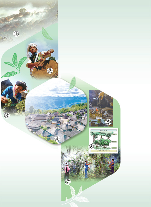 “构成‘普洱景迈山古茶林文化景观’的遗产要素即5片古茶林,9个村寨以及3片分隔防护林,其中村寨的布局及设计都是世居民族与自然长期和谐发展的结果。”北京清华同衡规划设计研究院遗产地可持续发展研究所所长邹怡情说,“在当地,茶文化无所不在,生产生活的方方面面都围绕着茶,当地人甚至将茶的元素做到屋檐上、服饰上和歌谣中。比如坐落在景迈山半山腰的芒景村是一个布朗族村寨,村寨屋顶上的图腾‘一芽两叶’,讲述着村民与茶的渊源。”